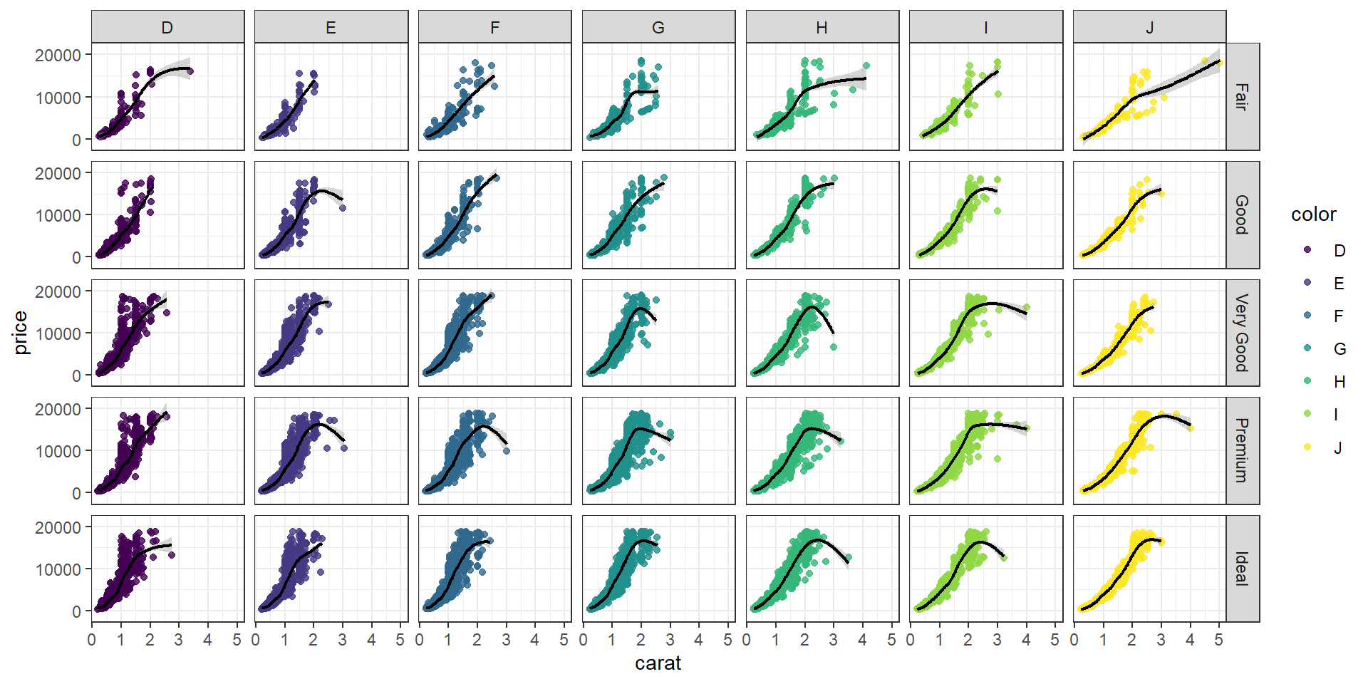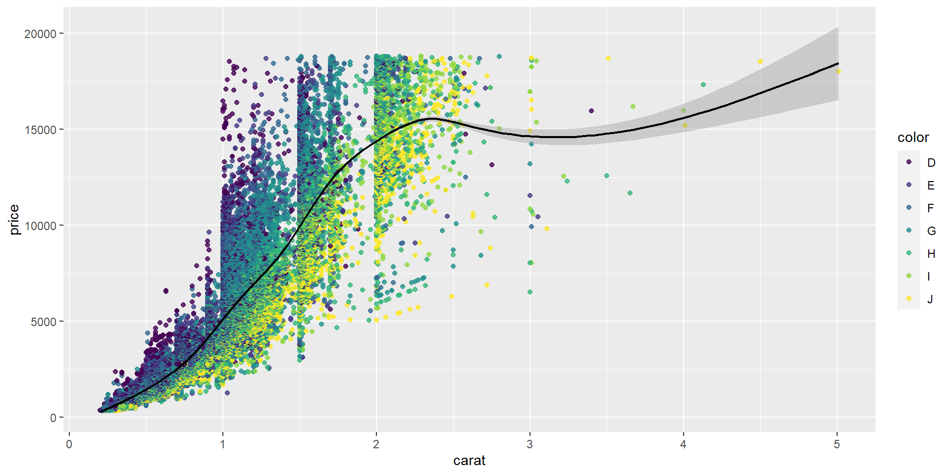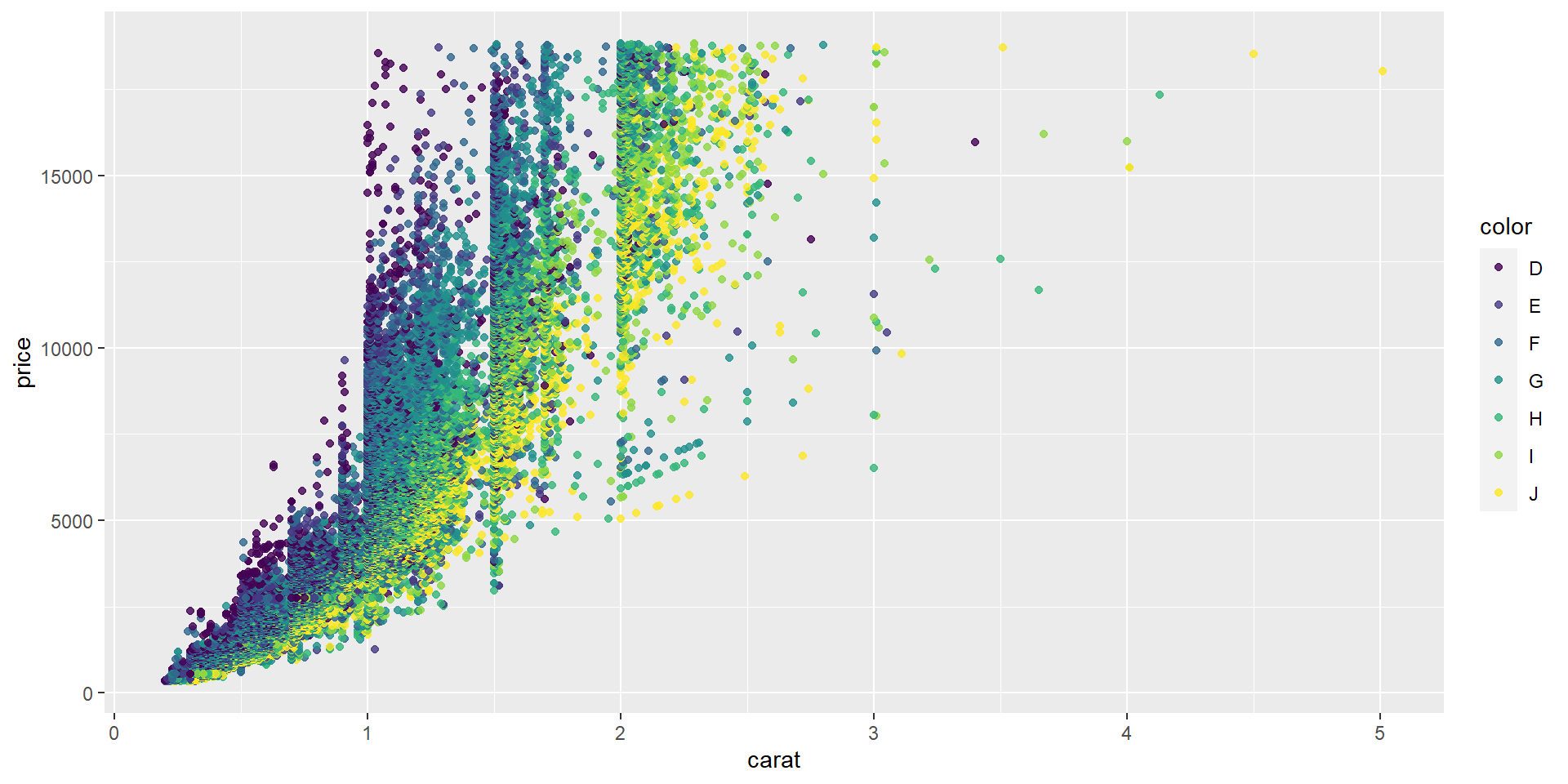 ggplot(diamonds, aes(x = carat, y = price, color = color)) +