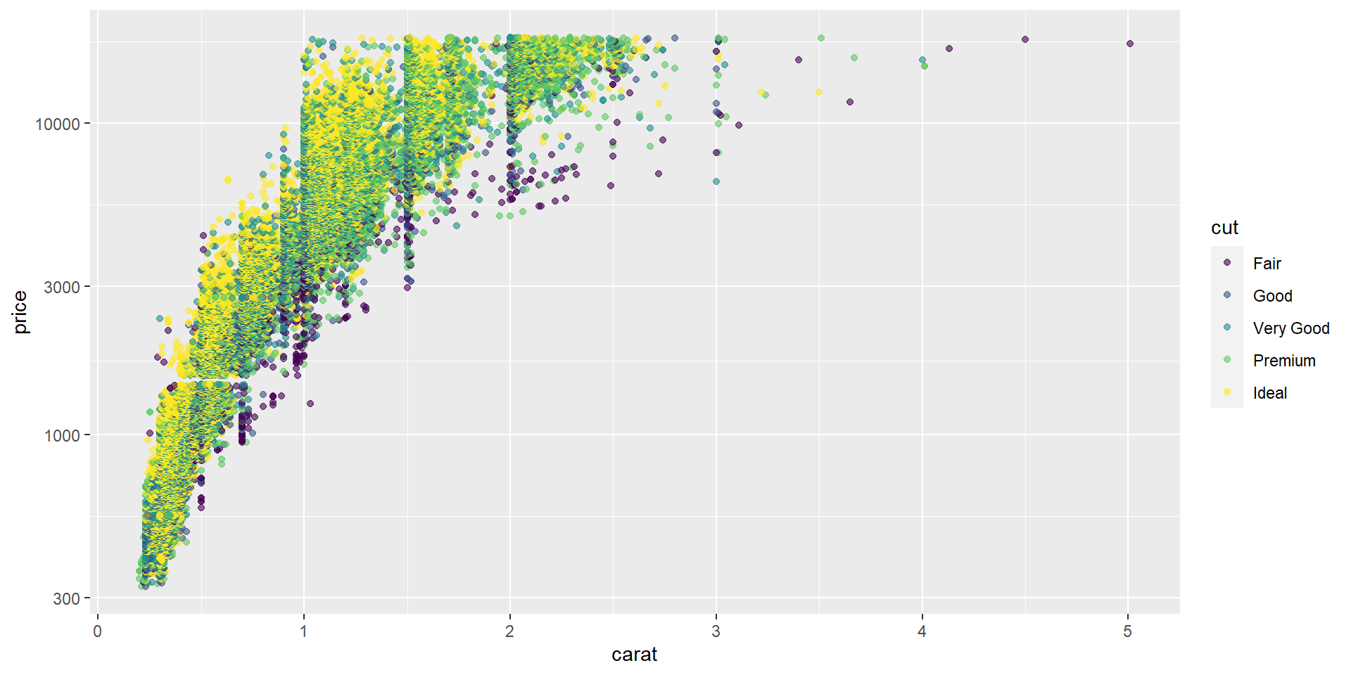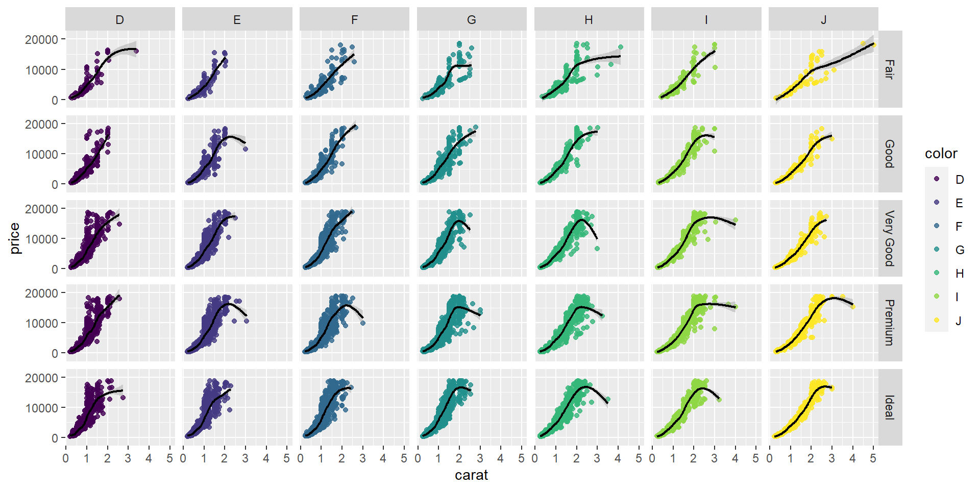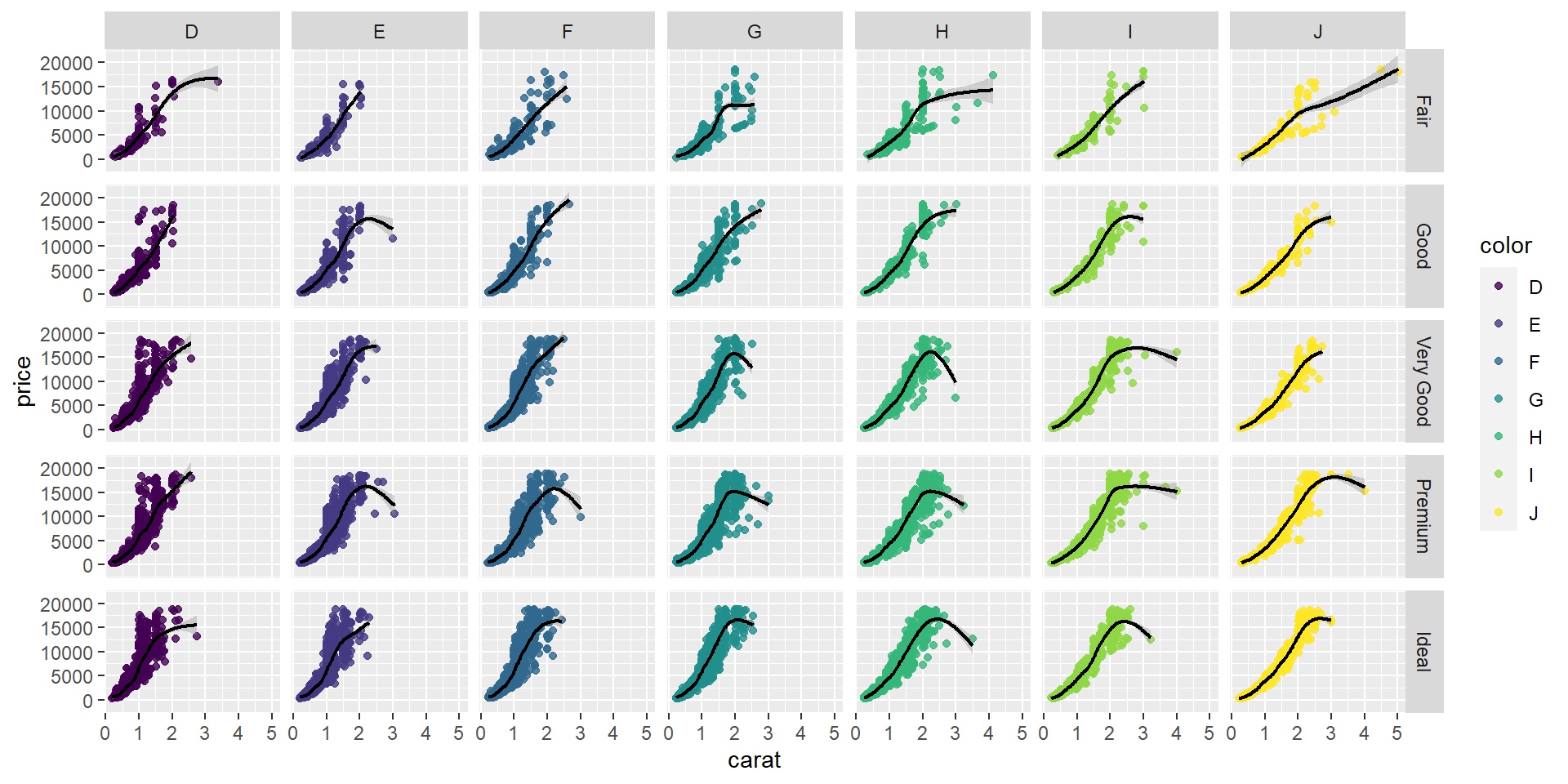 ggplot(diamonds, aes(x = carat, y = price, color = color)) +