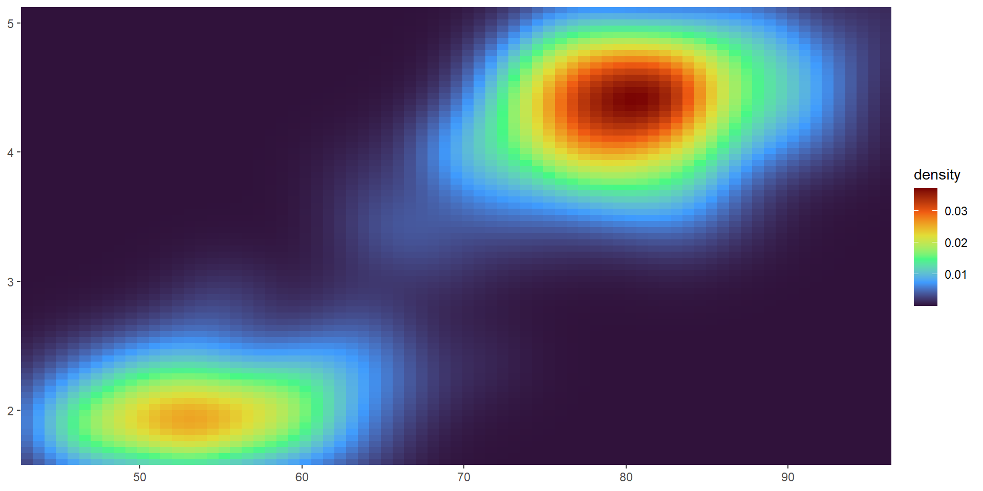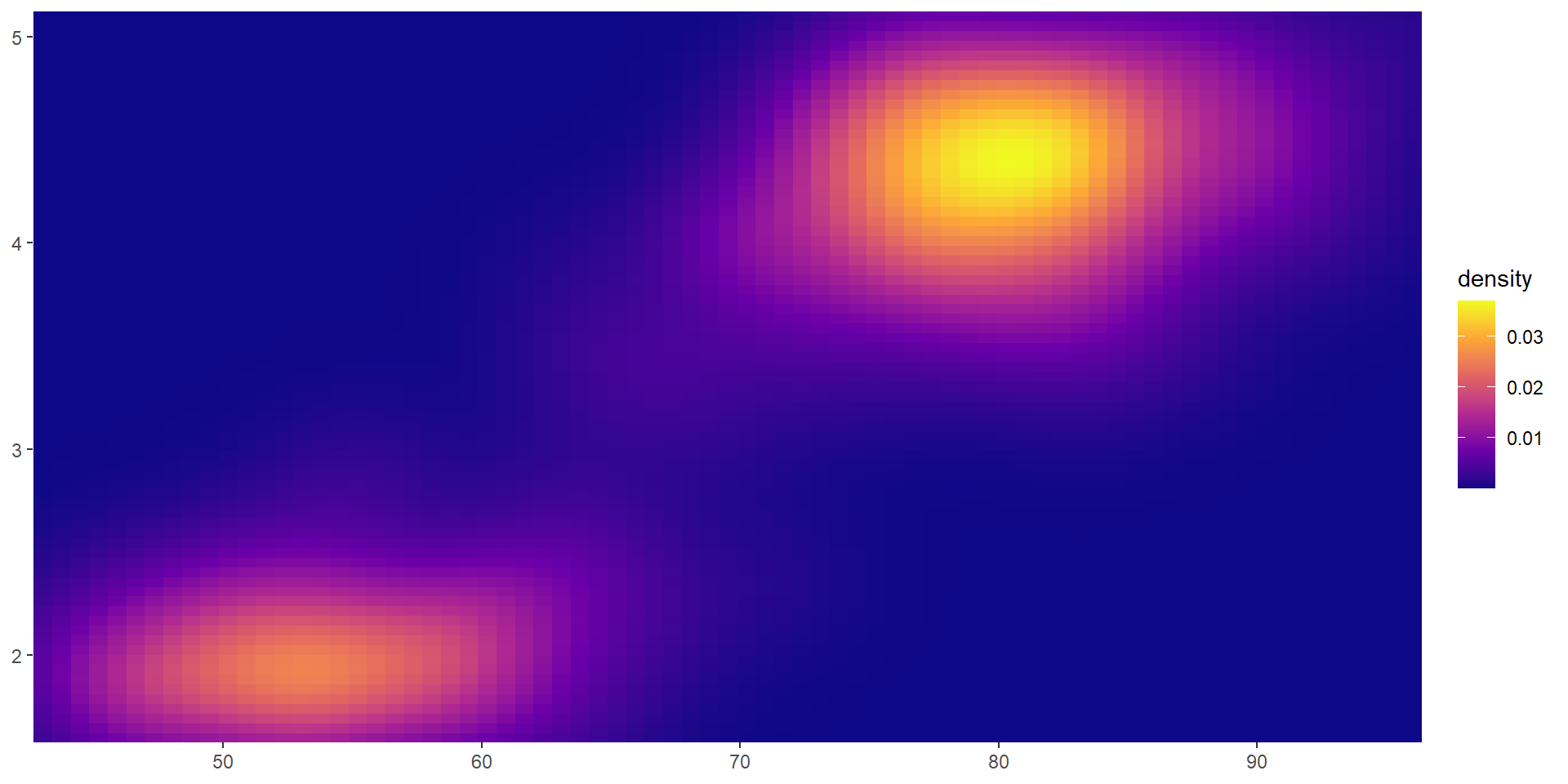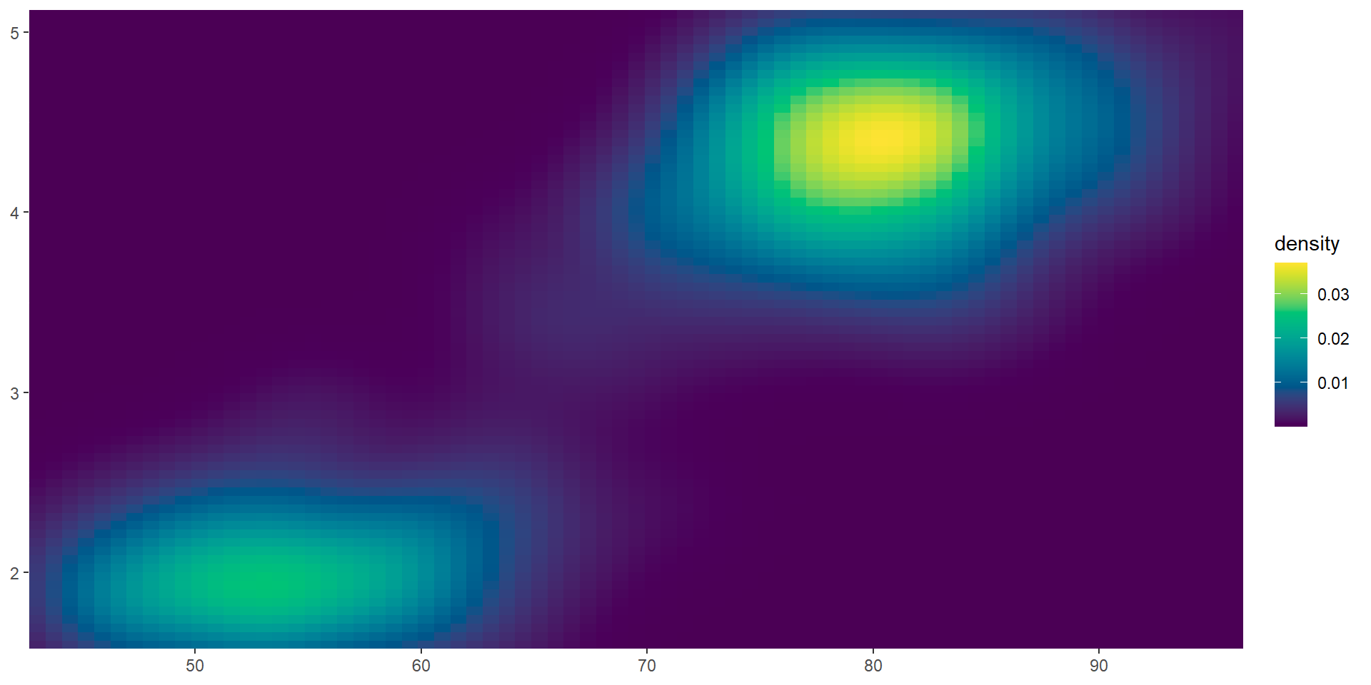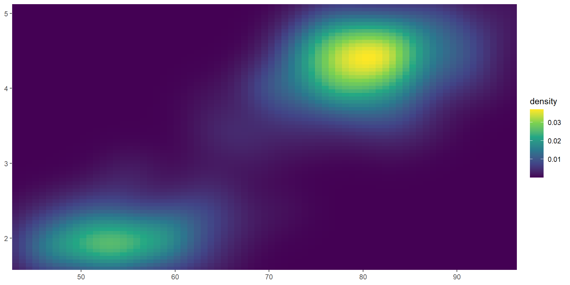 viridis color paletteserupt <- ggplot(faithfuld, aes(waiting, eruptions, fill = density)) +