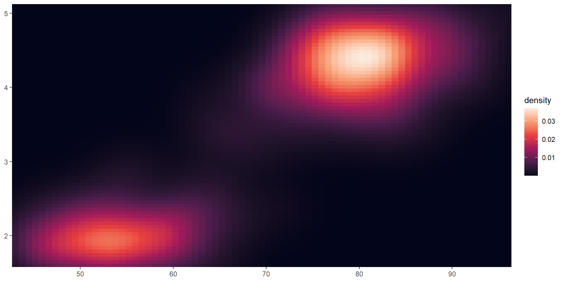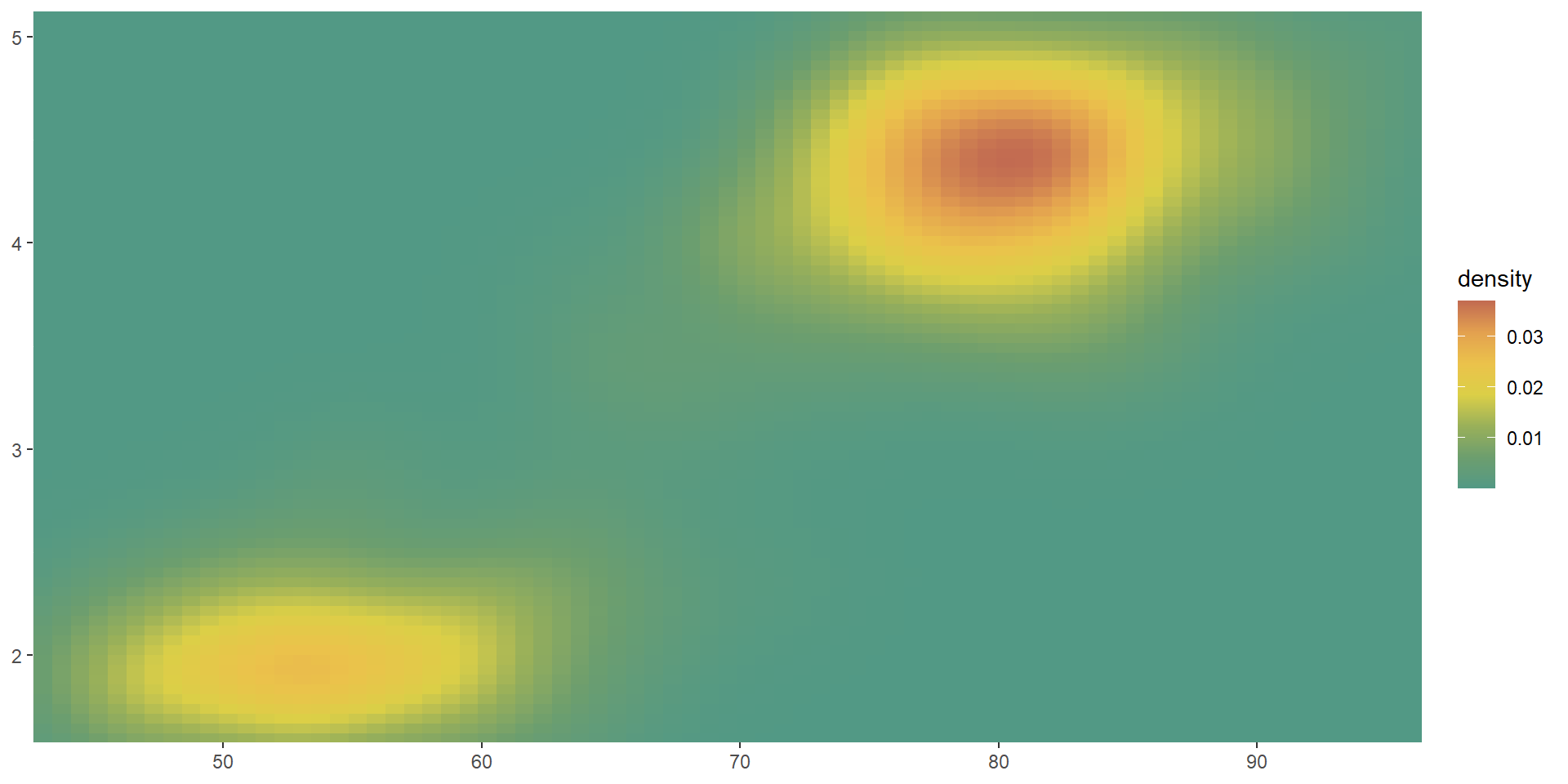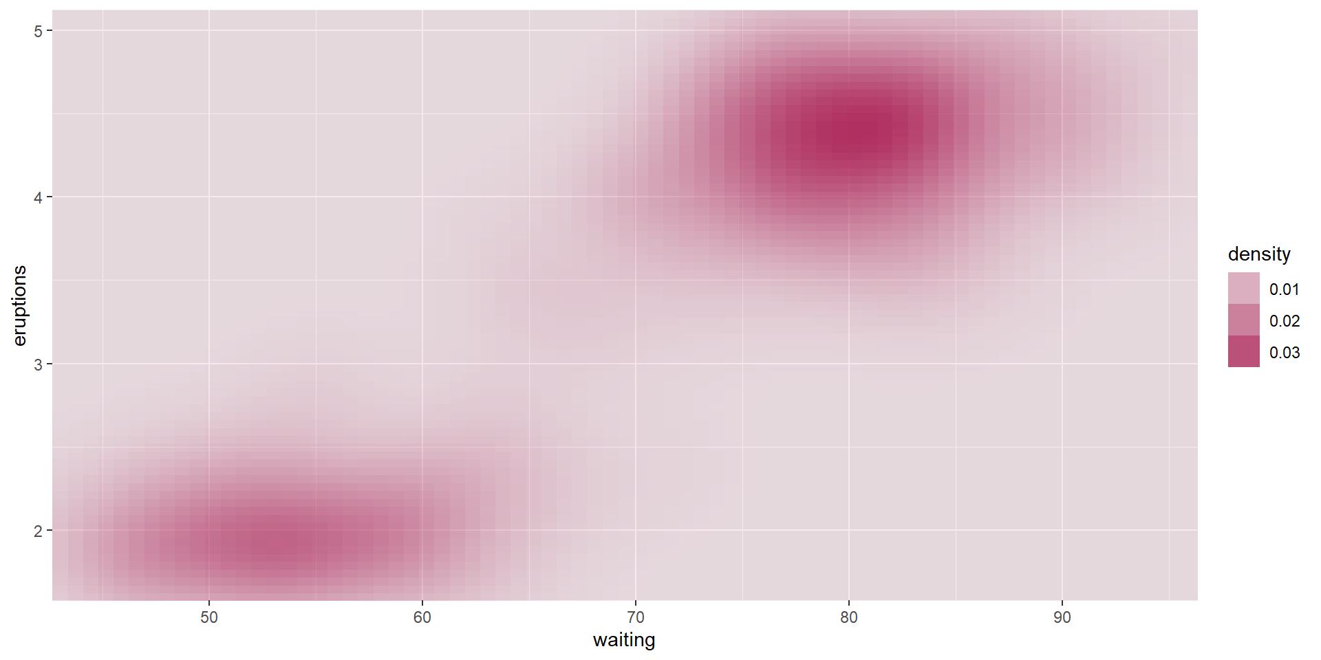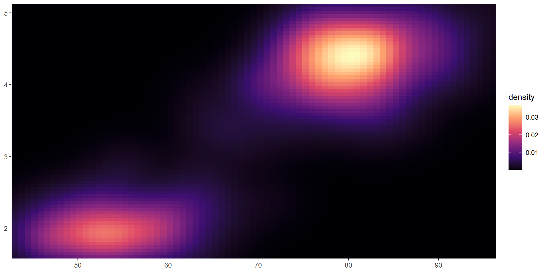viridis color paletteserupt <- ggplot(faithfuld, aes(waiting, eruptions, fill = density)) +